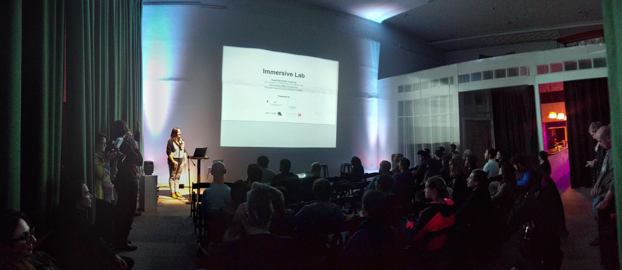 The ten new pieces created during the workshop are shown during the meetup, with 10 persons entering the Immersive Lab at a time. This makes for a full evening of talks, encounters and experiences, with a total audience of approx. 200 people.