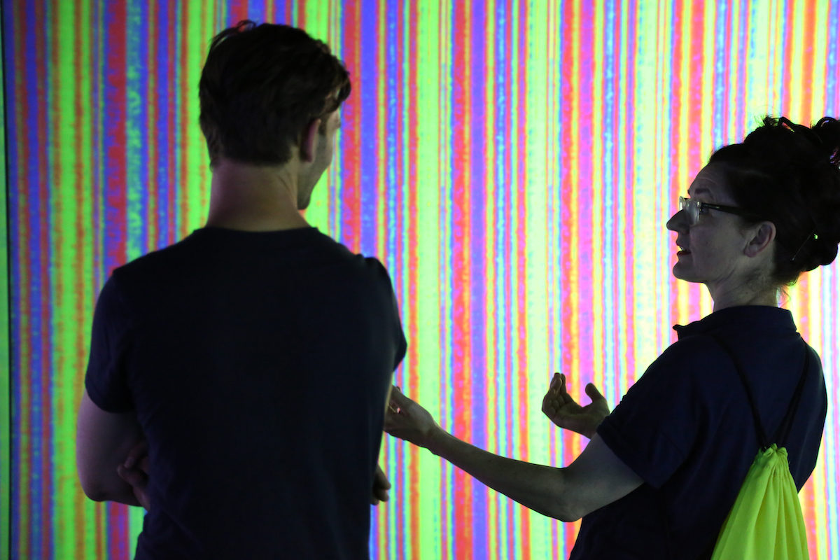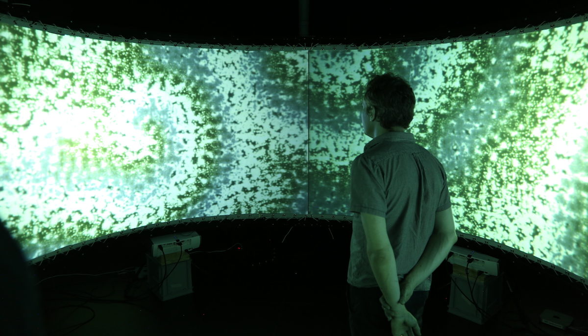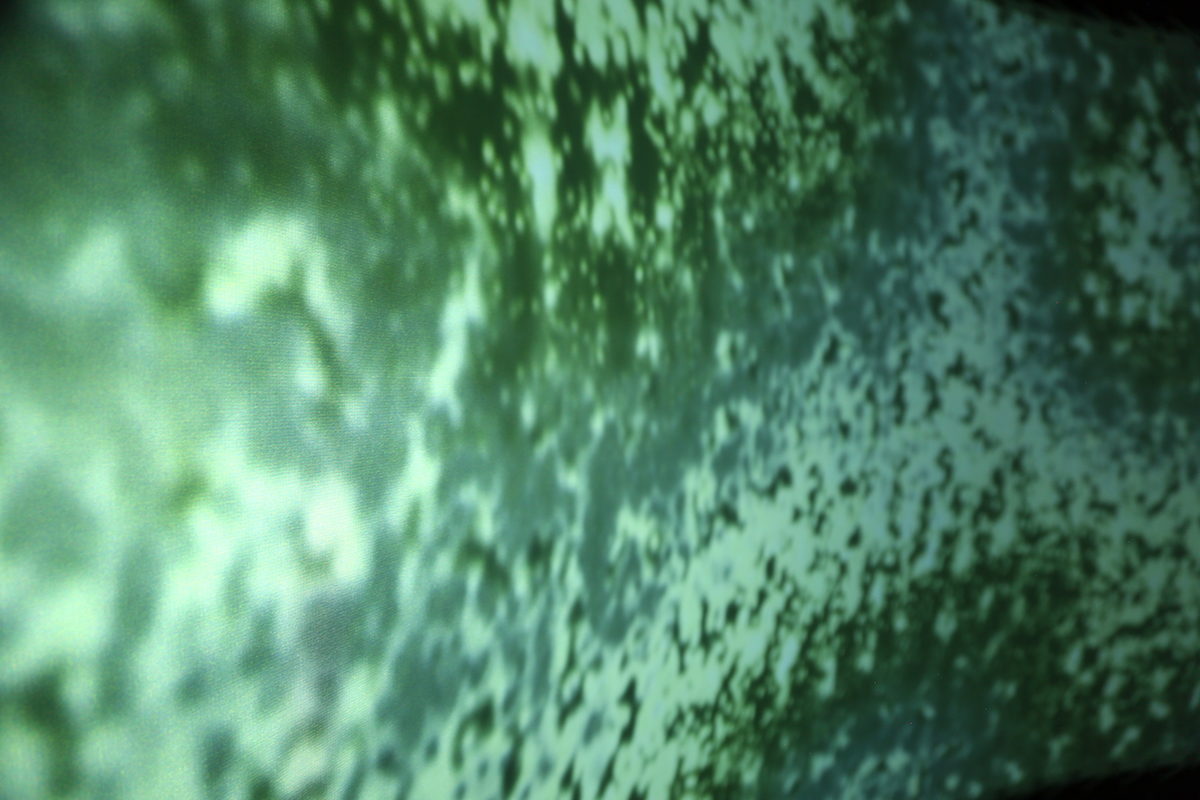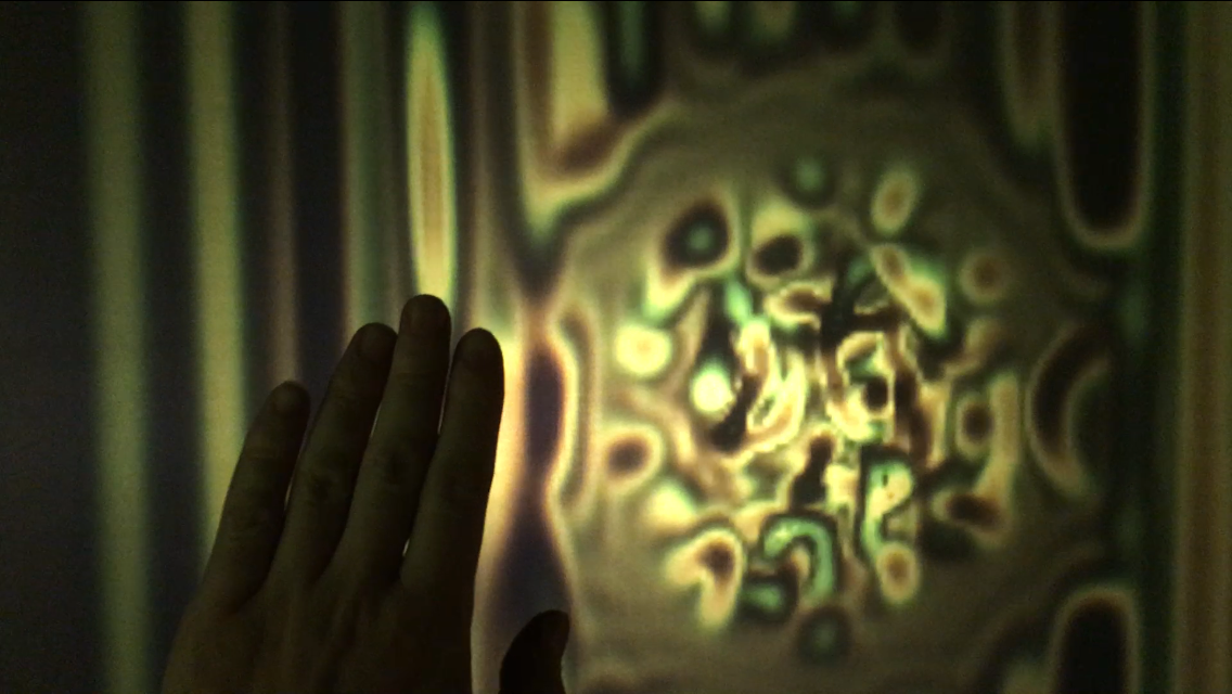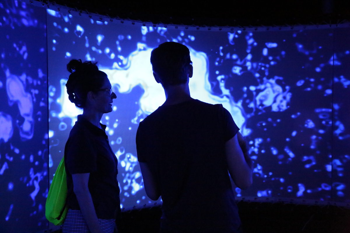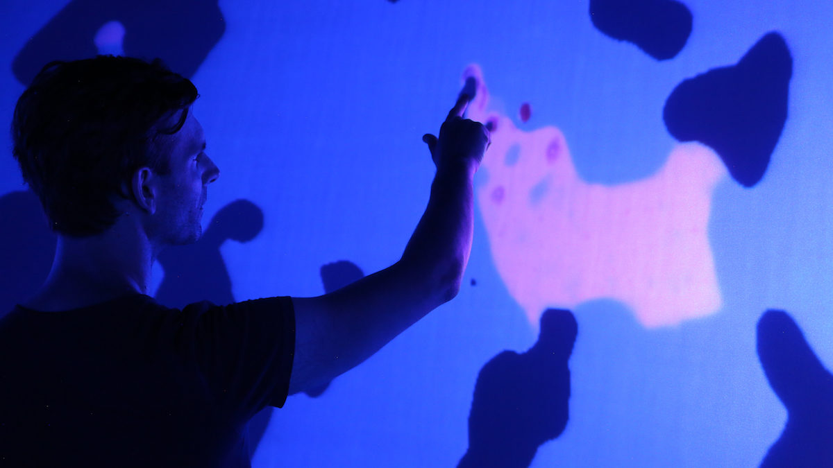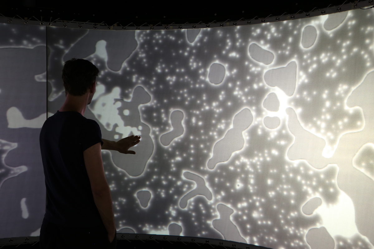 The audience can experience the piece and also interact with it by touching the installation surface. Depending on the current section of the composition, the audience can encourage the simulation to exhibit growth, make it shrink, or entirely lose any control over its behavior. The simulation is also driving a multichannel sound synthesis that spreads throughout the 16 speakers of the installation.