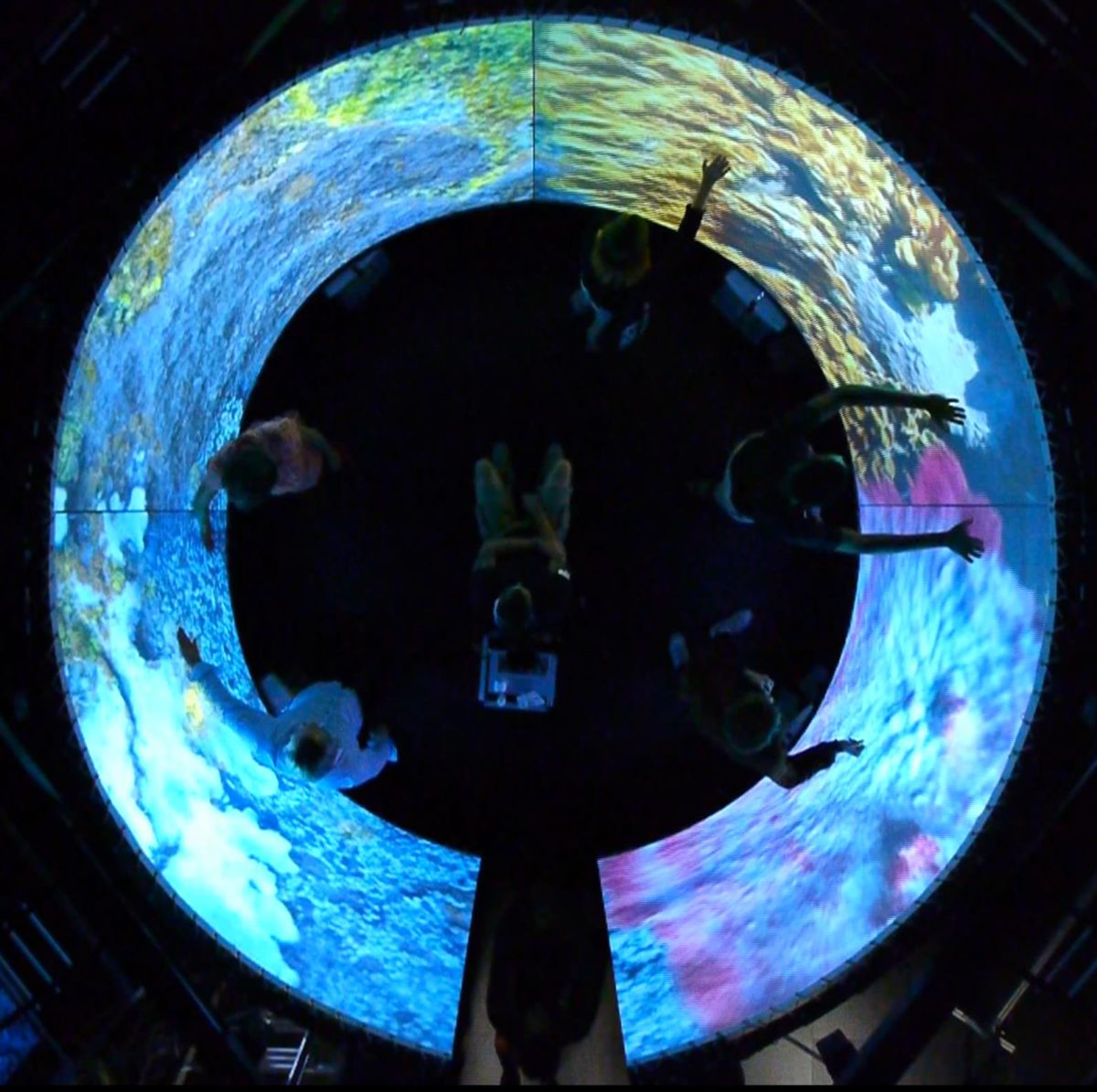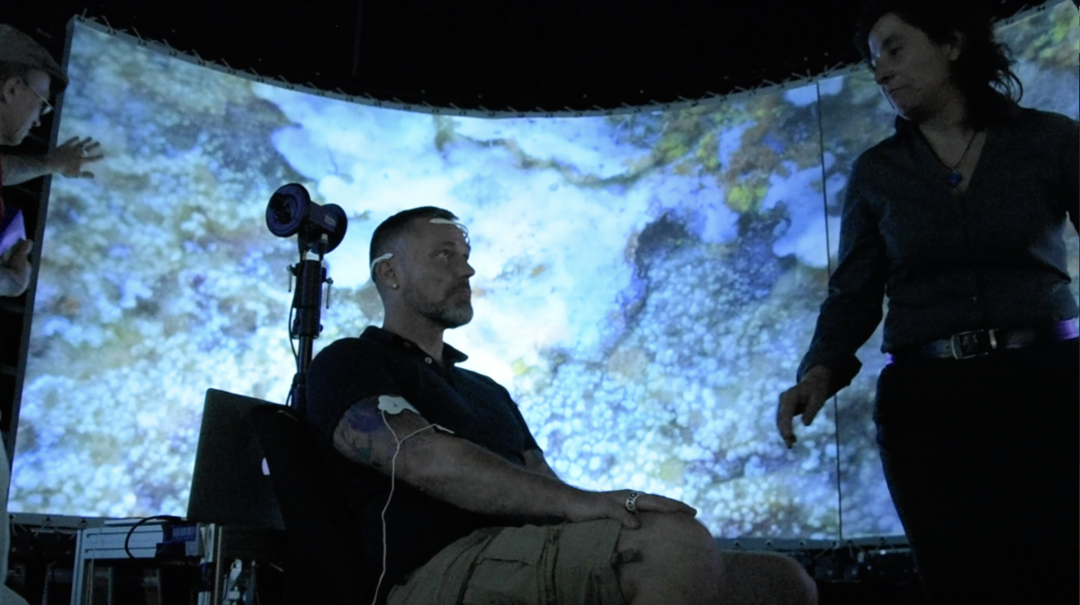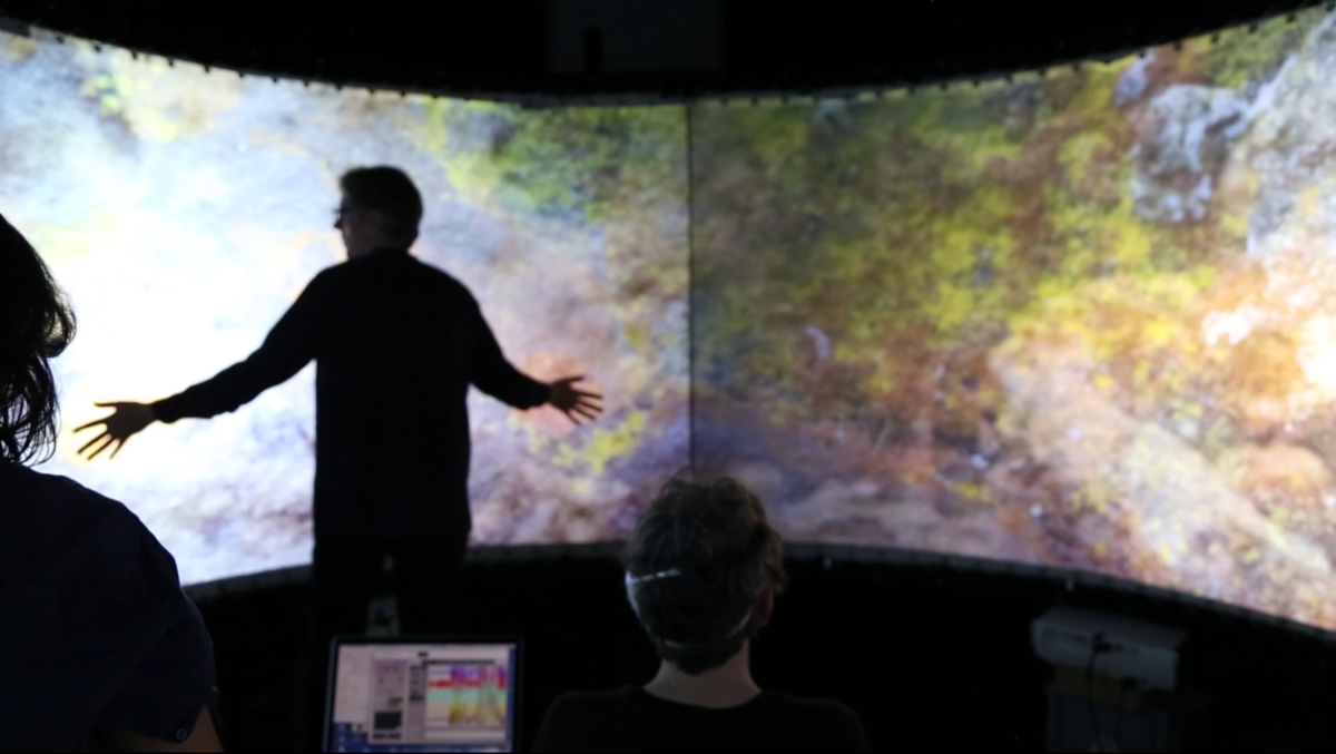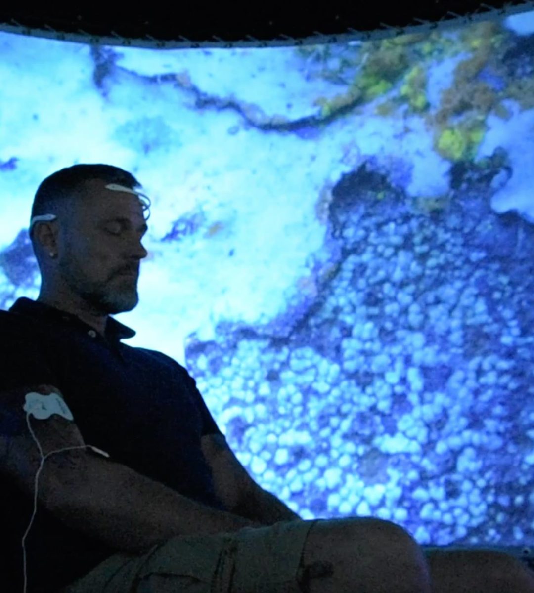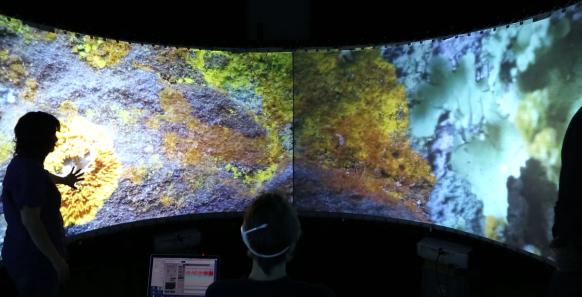 It consists basically of two types of participants: the central figure or host, sitting in the middle of the panoramic video space, whose brainwaves’ values are collected via an EEG interface in order to influence the sonic environment; the second type of participant is represented by the guest(s), visitors who, by touching the screens, influence the host’s emotional states through to the tactile transducers that are attached to the chair where the host is seated and consequently, also the audiovisual environment.