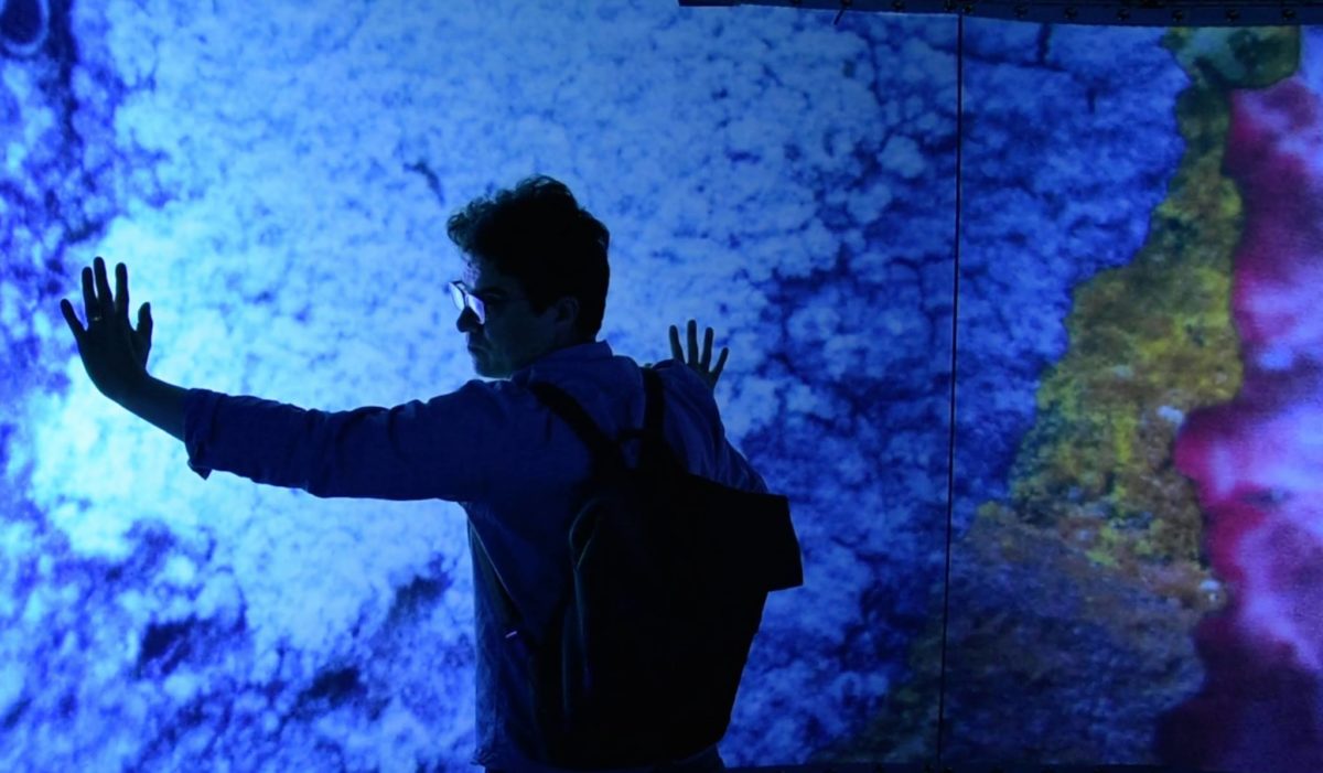 The host is therefore an intermediary, through whom the interaction between visitors and environment happens when visitors touch the screens: each touch sends data transformed in frequencies to the tactile transducers which are received by the host, influencing his/her emotional reactions and consequently, his/her mental processing (brainwaves). These values are captured by an EEG interface and transmitted to the computer, where different algorithms impact on the sonic aspects of the audiovisual environment, creating a feedback loop where the host is affected by the audience’s actions, whilst the audience is simultaneously affected by the host‘s reaction measured via his/her brainwaves. The screens become consequently the skin of the host.