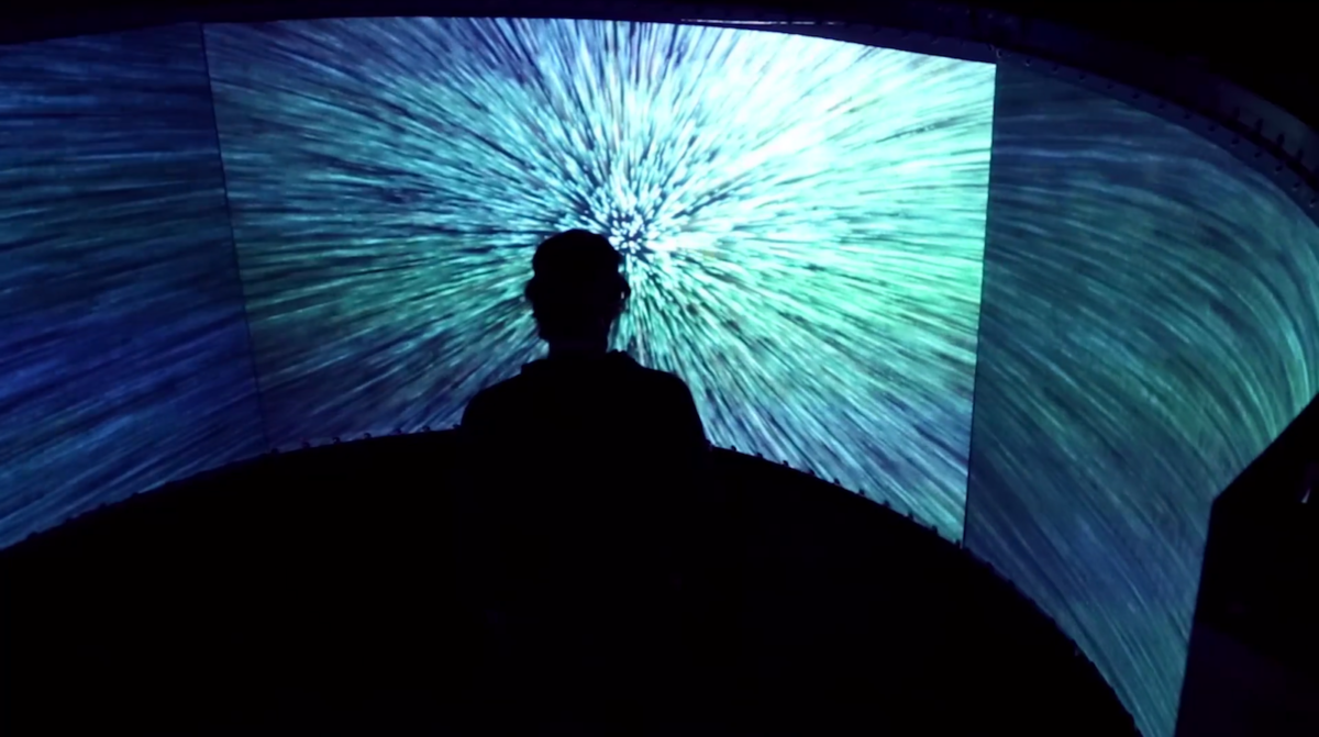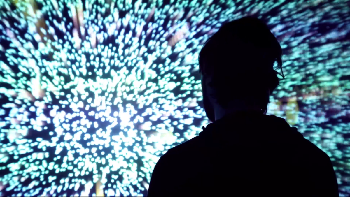 The inner sense of position and movement in space of the person gets projected or linked onto a physically present, enveloping audio-visual flow of particles. The resulting amalgated experience points toward the concept of `telekinesis’. Thus, the installation can be experienced as a participant-centric telekinetic steering of the energetic particle flow. Alternatively, it can be felt as a physical translocation inside a stream, where the sense of position and centrality gets lost, even if momentarily.
