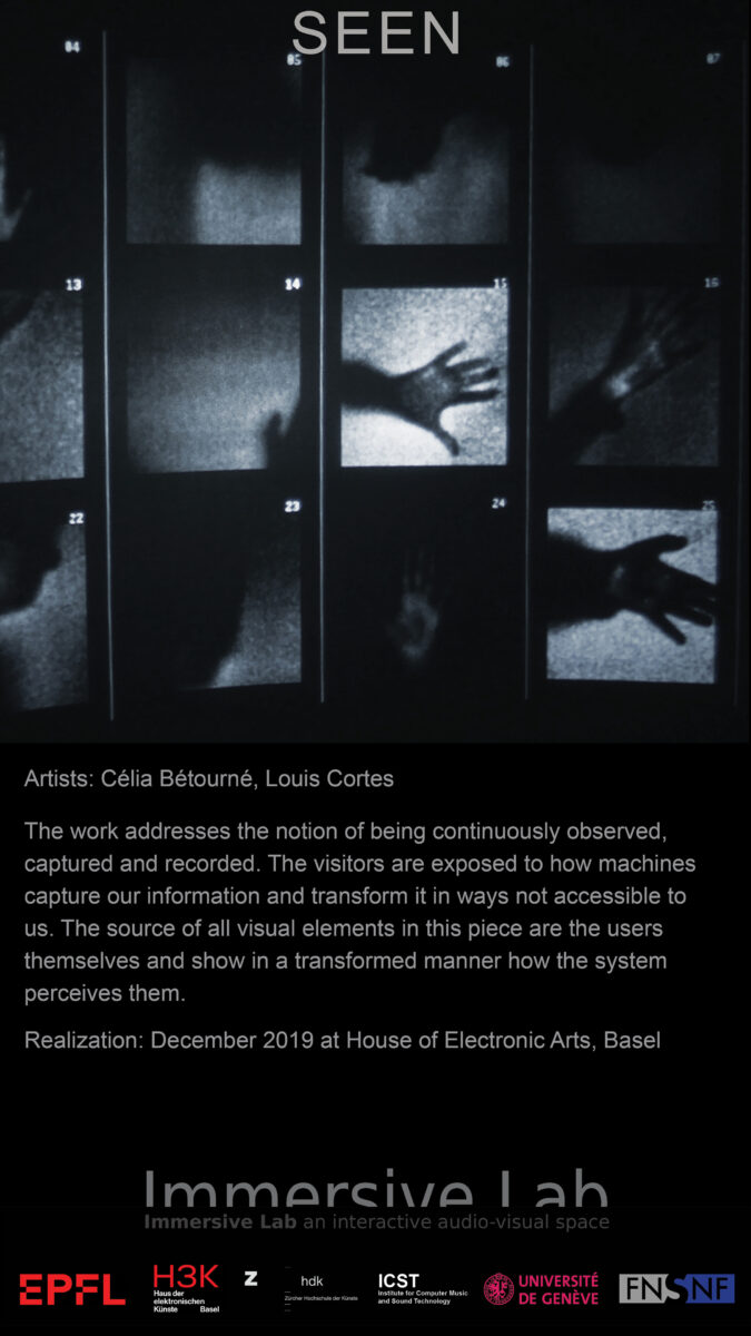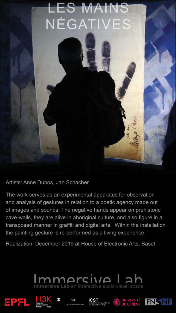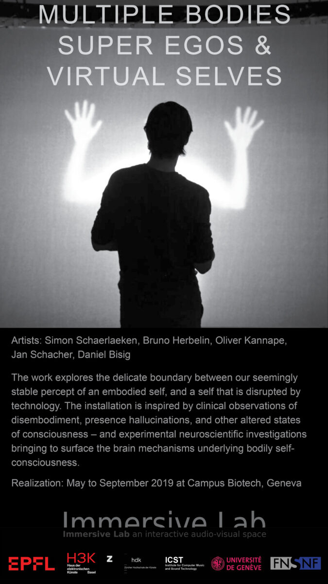 The list of works in the exhibition includes: Connect (by Simon Schaerlaeken and Donald Glowinski), Multiple Bodies, Super Egos & Virtual Selves (by Simon Schaerlaeken, Bruno Herbelin, Oliver Kannape, Jan Schacher, Daniel Bisig), Coexistence (by Nadine Cocina and Romana Sprenger), Seen (by Célia Bétourné and Louis Cortes), Les Mains Négatives (by Anne Dubos and Jan Schacher).