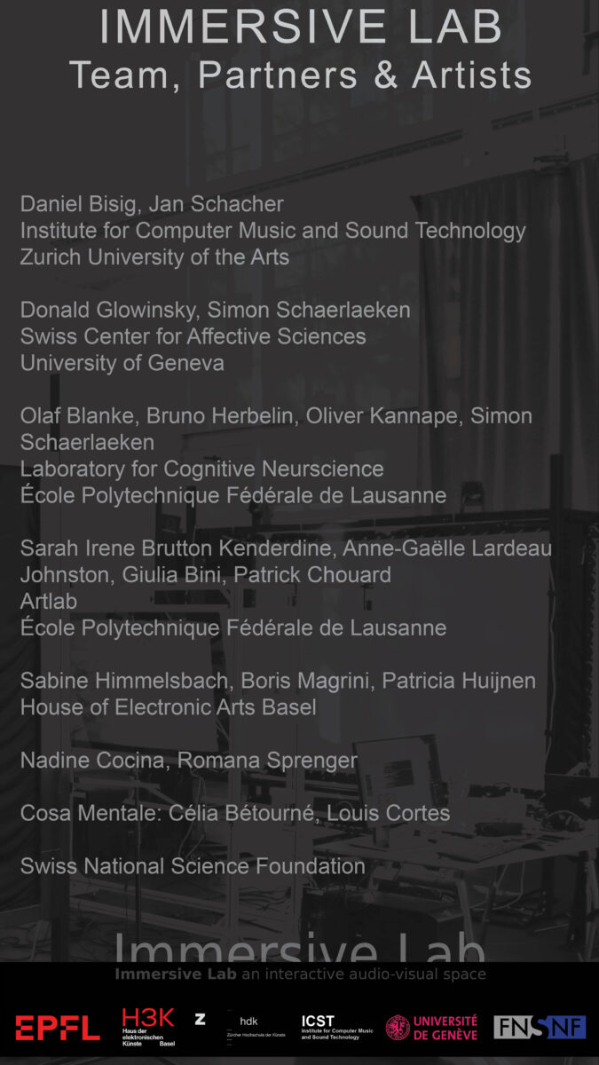Imaginé par Daniel Bisig et Jan Schacher, tous deux artistes numériques, et chercheurs à l’Institut d’informatique musicale et de technologie du son de la Haute École dʹart de Zurich, l’Immersive Lab est, un espace interactif et multisensoriel qui vise à mettre en réseau l’art et la science. Immersion multifacette avec Jan Schacher, co-concepteur du projet, artiste numérique et chercheur à l’Institut d’informatique musicale et de technologie du son de la Haute École dʹart de Zurich, et Bruno Herbelin chercheur au laboratoire de neurosciences cognitives à l’Ecole polytechnique fédérale de Lausanne (EPFL). Une chronique de Sarah Dirren