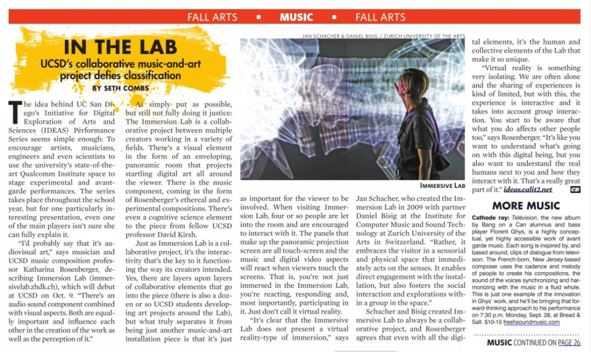 The idea behind UC San Diego’s Initiative for Digital Exploration of Arts and Sciences (IDEAS) Performance Series seems simple enough: To encourage artists, musicians, engineers and even scientists to use the university’s state-of-theart Qualcomm Institute space to stage experimental and avantgarde performances. The series takes place throughout the school year, but for one particularly interesting presentation, even one of the main players isn’t sure she can fully explain it.