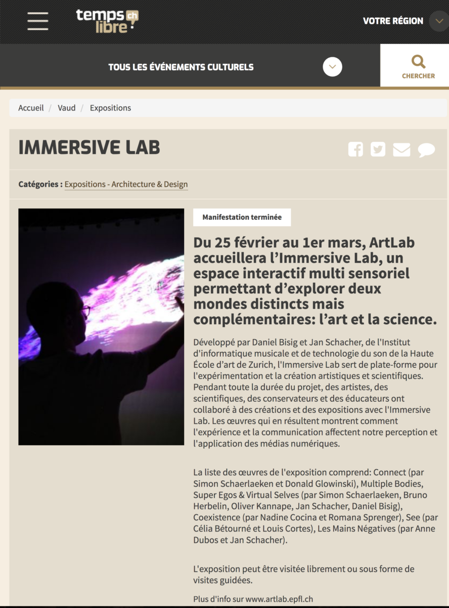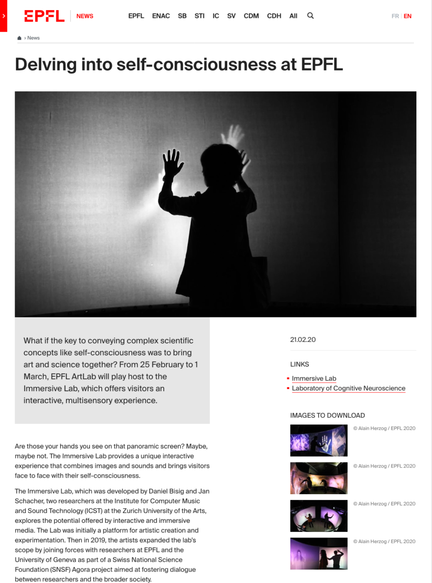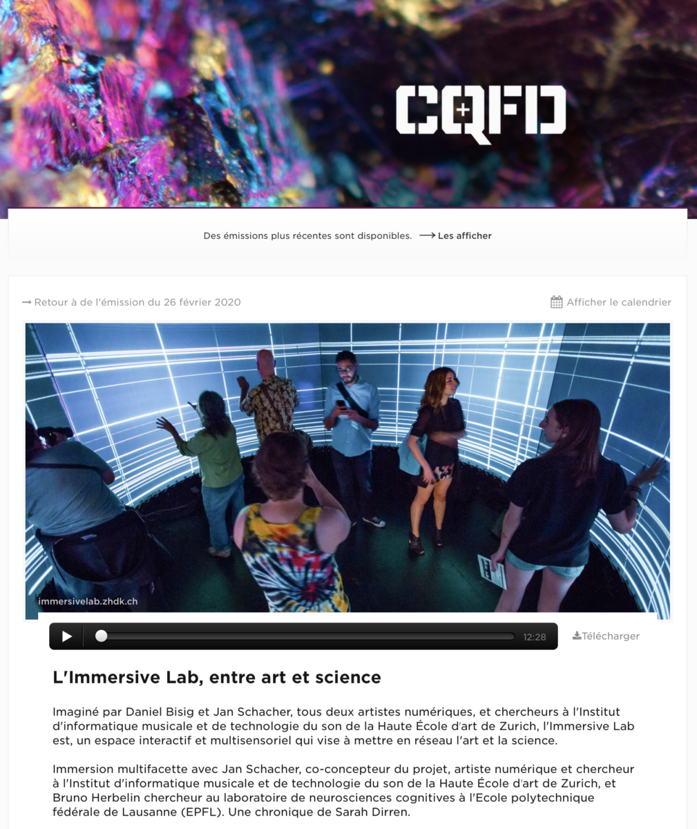 Imaginé par Daniel Bisig et Jan Schacher, tous deux artistes numériques, et chercheurs à l’Institut d’informatique musicale et de technologie du son de la Haute École dʹart de Zurich, l’Immersive Lab est, un espace interactif et multisensoriel qui vise à mettre en réseau l’art et la science. Immersion multifacette avec Jan Schacher, co-concepteur du projet, artiste numérique et chercheur à l’Institut d’informatique musicale et de technologie du son de la Haute École dʹart de Zurich, et Bruno Herbelin chercheur au laboratoire de neurosciences cognitives à l’Ecole polytechnique fédérale de Lausanne (EPFL). Une chronique de Sarah Dirren