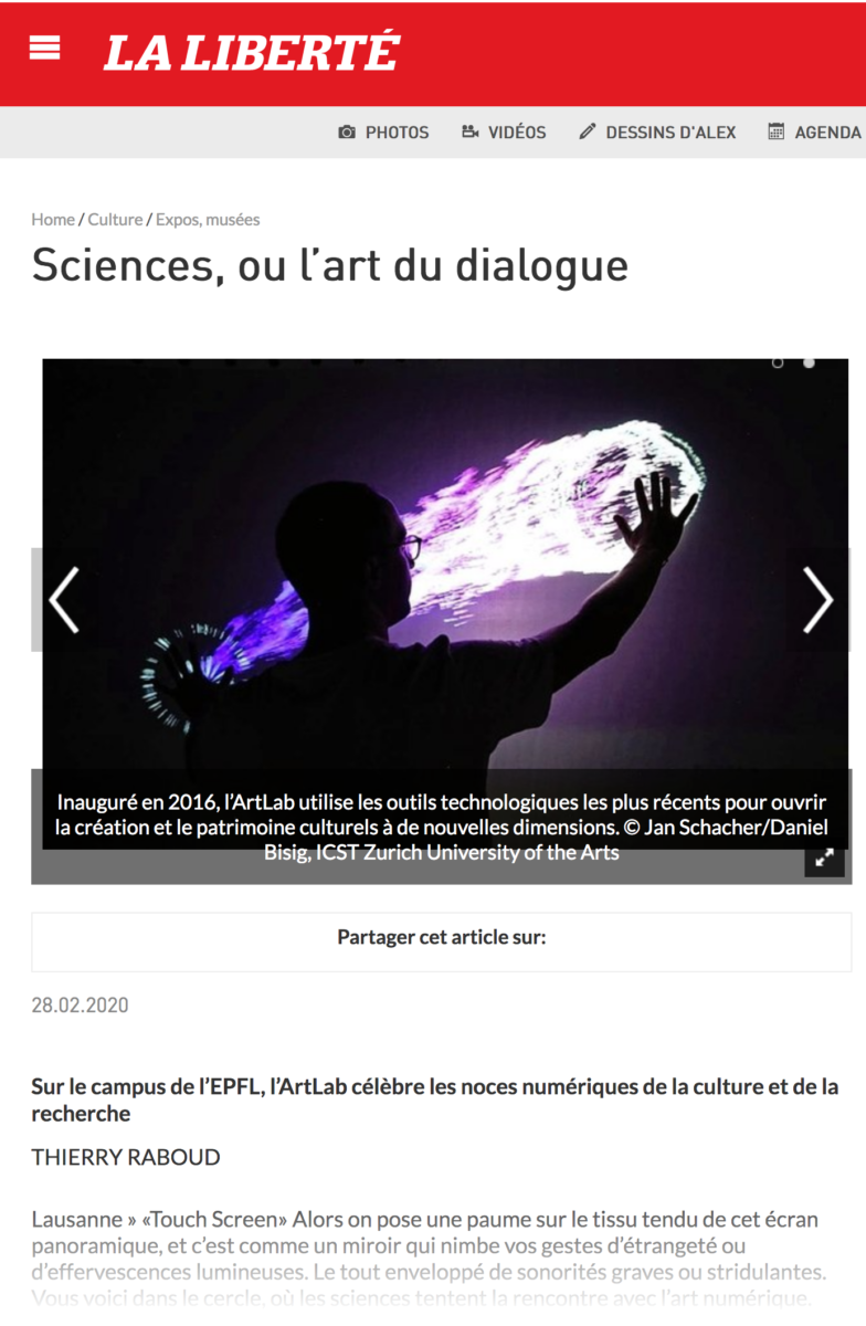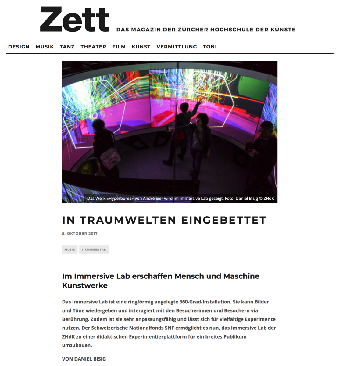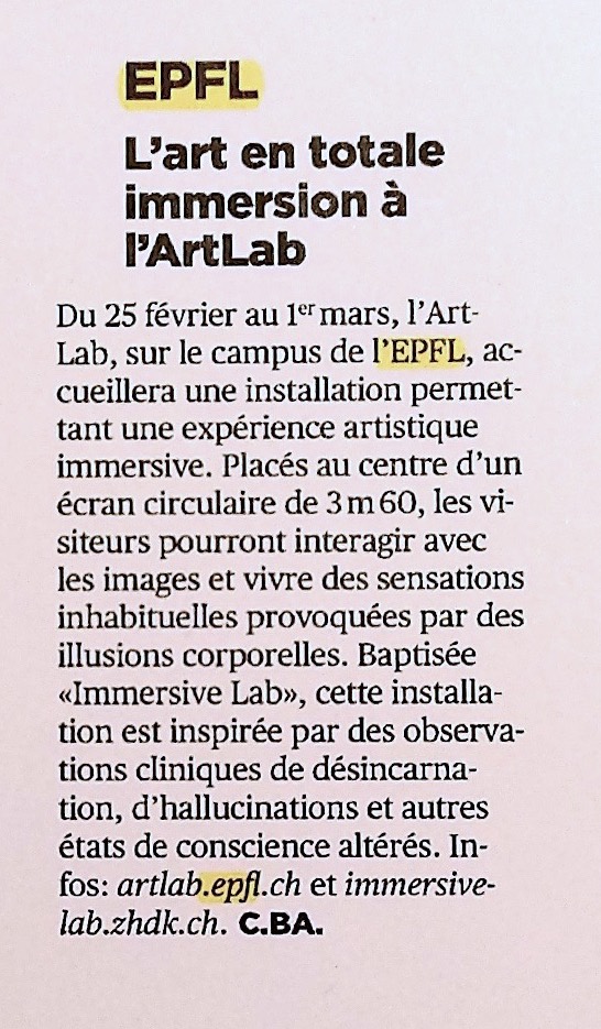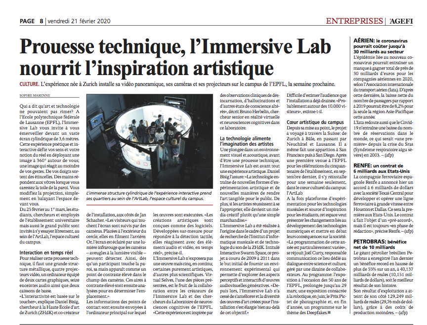Imaginé par Daniel Bisig et Jan Schacher, tous deux artistes numériques, et chercheurs à l’Institut d’informatique musicale et de technologie du son de la Haute École dʹart de Zurich, l’Immersive Lab est, un espace interactif et multisensoriel qui vise à mettre en réseau l’art et la science. Immersion multifacette avec Jan Schacher, co-concepteur du projet, artiste numérique et chercheur à l’Institut d’informatique musicale et de technologie du son de la Haute École dʹart de Zurich, et Bruno Herbelin chercheur au laboratoire de neurosciences cognitives à l’Ecole polytechnique fédérale de Lausanne (EPFL). Une chronique de Sarah Dirren