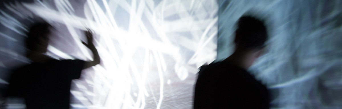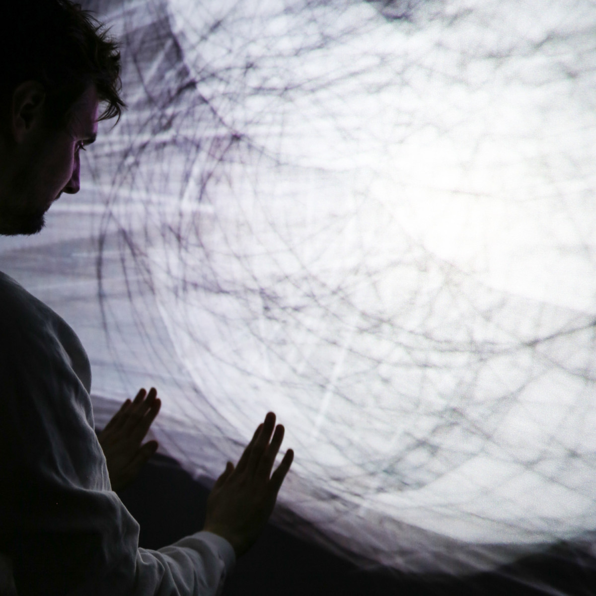 Trails was originally conceived as a generative artwork that evolves spontaneously without any human intervention. In order to adapt the work to the Immersive Lab, certain properties of the simulation have been rendered accessible for interactive manipulation. By touching the screen, visitors can influence the spatial position or confinement of the entities of the flocking simulation and thereby affect the generation of audio and video.
